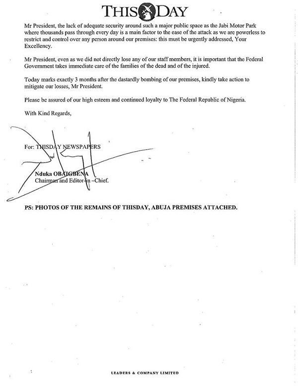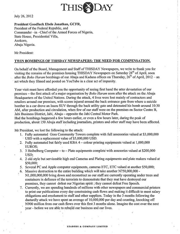 Obaigbena had written to former President Goodluck Jonathan on July 26, 2012, seeking compensation for the Boko Haram attack which left four persons dead and destroyed properties estimated by THISDAY to be N2.4 billion. He also asked for extra provision of security to protect lives and property at the office.